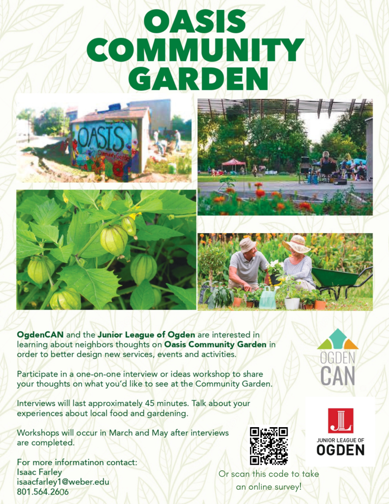 Call for community input: Please email isaacfarley1@weber.edu to let us know what you think about our neighborhood garden. We want it to be the best it can be and know that your opinions can help make that happen. More details, can be found on the flyers below. You can also call in to share your thoughts at (801) 564-2606. Isaac is a great advocate for our community, is very easy to talk to and is a wonderful listener so a conversation would be fun. Or even just scan the QR code below or click on this link https://forms.gle/YCALhc81i54mZvMUA to fill out a short online survey.