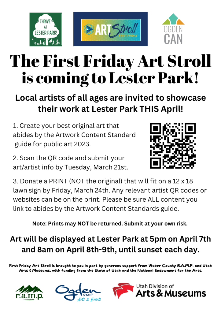 We plan on putting donated prints on lawn signs and setting them out around the park during daylight hours from April 7th-9th. Please see the attached flyers for application details. Complete the online submission form by March 21st, with prints due by March 24th. Depending on how this first art stroll goes, we may do more in the park, and even feature poetry or QR codes linked to original music. The possibilities are endless!